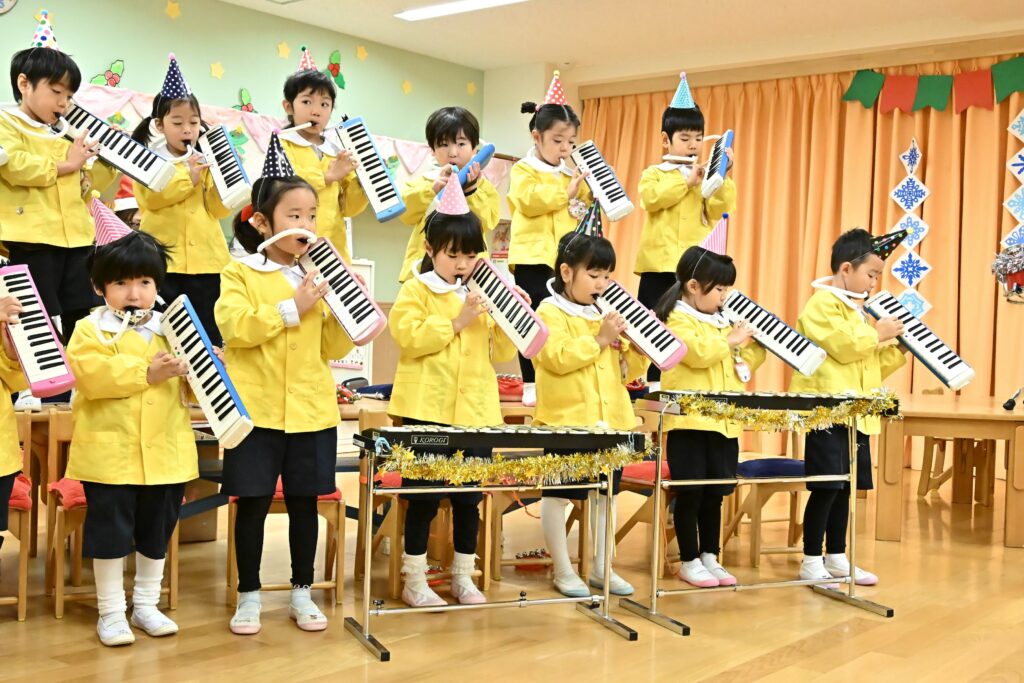 そして、この日のために、みんなが演奏してきた鍵盤ハーモニカやハーモニカ・鈴やタンバリン・小太鼓などたくさんの楽器を使ってクリスマスソングをサンタさんと一緒に楽しみました☆子どもたちはサンタさんに頑張っている姿を見てもらおうと張り切っていました。