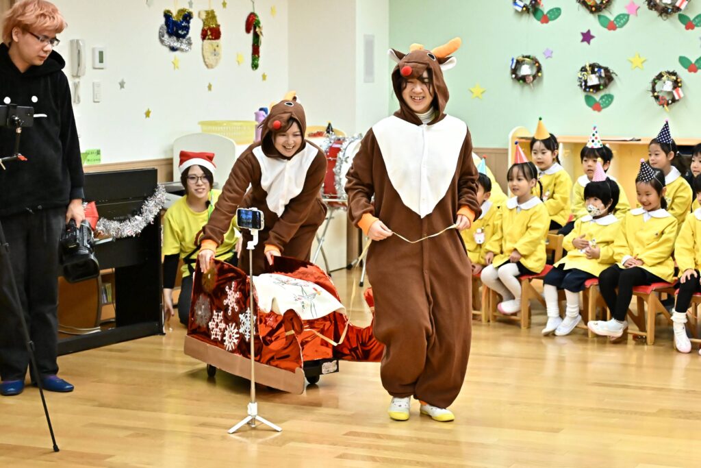 みんなの素敵な音色に誘われてトナカイさんも登場しました!サンタさんにもインタビューしたり、プレゼントを頂きお礼を伝えたり、子どもたちの歌声や笑い声が響き素敵なクリスマス会になりました!
