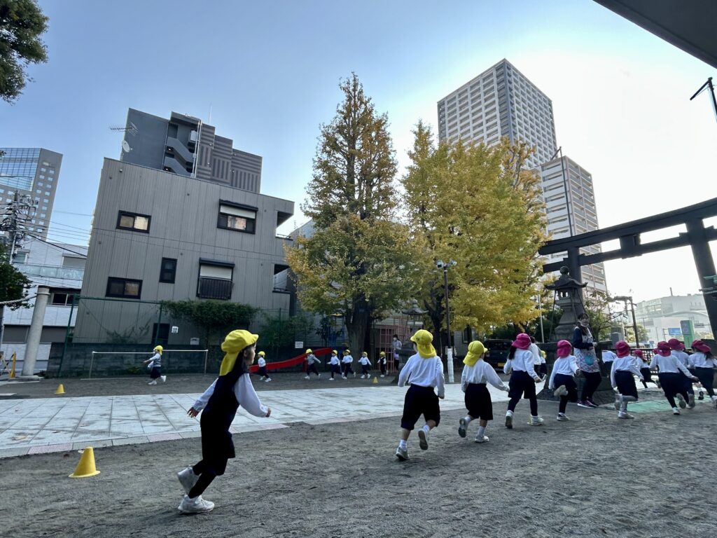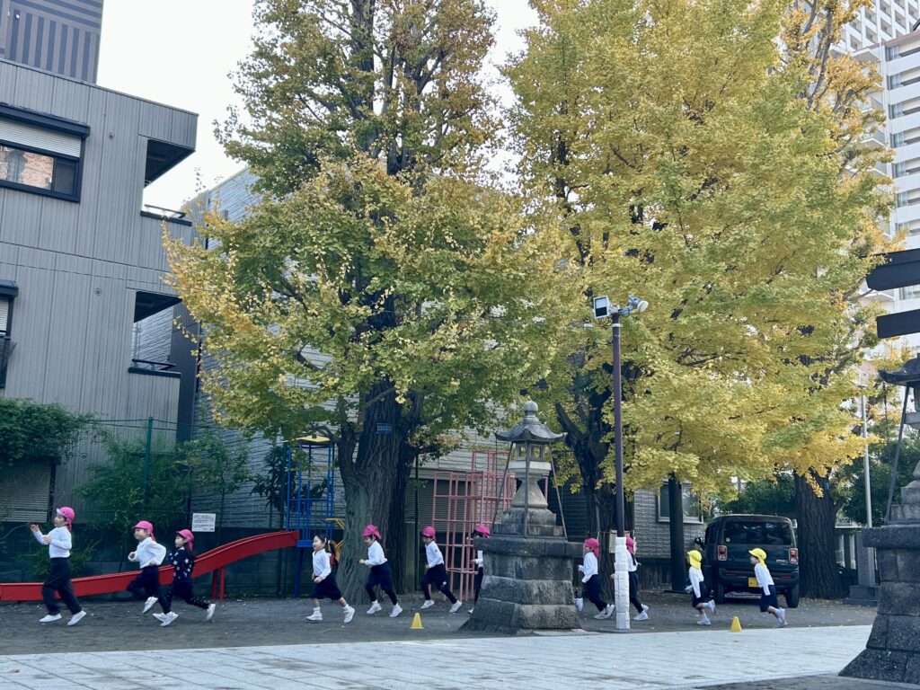 来週から12月だというのに、園庭のイチョウはやっと少しづつ黄金色になってきました。