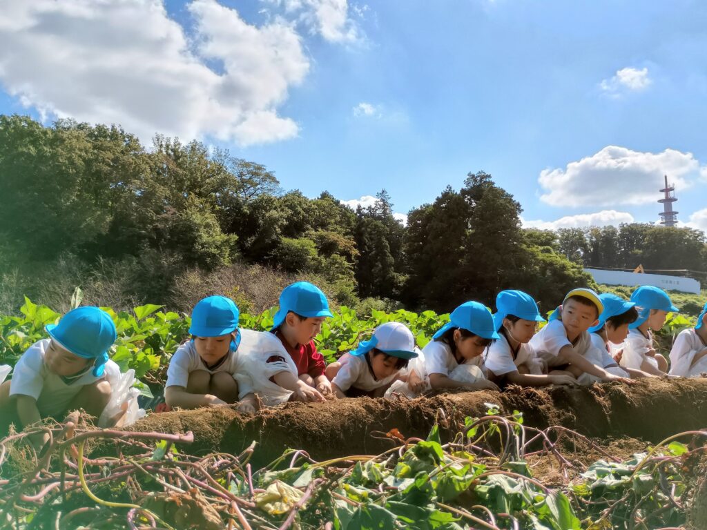 秋晴れの今日は、年中さんと年長さんはお芋ほり遠足です。
