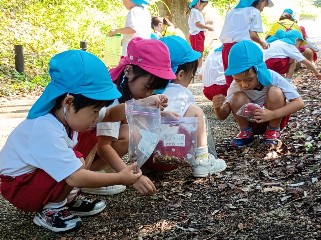 腹ごしらえが終わったら、お楽しみの公園遊び。走り回ったり、どんぐりを拾ったり、、